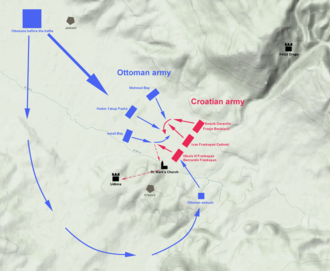 Skica bitke; ključnom za ishod borbe se pokazala zamka osmanlijskih snaga u koji je ušla vojska hrvatskog plemstva | |||||||