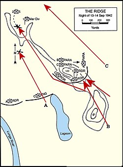 - ↑ Griffith, Battle for Guadalcanal, s. 156 i Smith, Bloody Ridge, s. 198–200. Kad su transportni brodovi iskrcali dio 7. puka marinaca, oni preuzimaju na njih preživjele borce iz 1. padobranskog bataljona, čiji broj iznosio oko 100 ljudi od prvobitnih 361 (Hoffman, Silk Chutes).