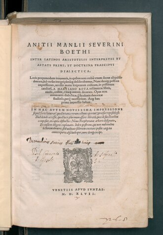 - ↑ Enciklopedijski članak: Boetije, Anicije Manlije Torkvat Severin u publikaciji: Slaven Ravlić, gl. ur., Hrvatska enciklopedija, Mrežno izdanje, Leksikografski zavod »Miroslav Krleža«, Zagreb, 2016., ISBN 978-953-268-038-6 (pristupljeno 3. veljače 2017.)