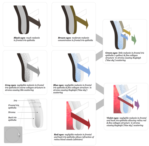 Boja očiju je poligenska osobina i određuje se prema količini i vrsti pigmenta u šarenici oka. Ljudi i životinje imaju mnogo fenotipskih varijacija u bojama očiju. Varijacije boja u ljudskim očima pripisuju se različitoj razini melanina kojeg proizvode melanociti u šarenici. Svijetlo obojene oči mnogih ptičjih vrsta su u velikoj mjeri određene prema drugim pigmentima, kao što su pteridini, purini i karotenoidi. Tri glavna elementa unutar šarenice doprinose boji: melanin u pigmentnom epitelu šarenice, melanin unutar strome šarenice i stanična gustoća strome šarenice. U očima svih boja, pigmentni epitel šarenice sadrži crni pigment, melanin. Varijacije boja među različitim šarenicama su obično određene sadržajem melanina unutar strome šarenice. Gustoća stanica u stromi utječe na to koliko svjetlosti će apsorbirati temeljni pigmentni epitel. OCA2 genski polimorfizam, blizu proksimalne 5 'regulatorne regije, objašnjava većinu varijacija u boji ljudskih očiju.