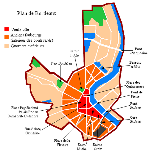 Gradom prolazi rijeka Garonne koja je dostupna morskim putom. Ovdje se nalazi zadnji most preko rijeke, Most Akvitanije. Gradska se aglomerizacija ubrzano razvija. U središtu grada, u četvrti Meriadeck razmišlja se o odvajanju pješačkog od automobilskog prometa. U gradu se može naći klasična, pravilna arhitektura, pogotovo u dvorcima od plavog kamena. Gradom vlada romanska, živa atmosfera.