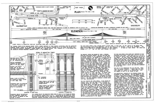 Most duljine 1825 m i glavnog raspona od 486 m bio je od završetka gradnje 1883. godine do 1903. najdulji viseći most na svijetu. Glavni projektant bio je John Augustus Roebling, a gradnju mosta završili su njegovi sin i snaha, Washington i Emily Roebling. Raspon čelične rešetkaste grede nalazi mu se na srednjoj visini od 40 m iznad vode, između dvaju vapnenačko-granitnih neogotičkih stupova visine 84 m. Nose ga četiri glavna kabela, potpomognuta čeličnom užadi koso položenom s vrhova stupova. Most se stoga smatra hibridom visećeg i ovješenog mosta.
