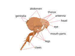 Vanjska anatomija buhe. U smjeru kazaljki na satu: genitalije, zadak, grudni koš, antene, glava, oko, dijelovi usta, noge, pandže.