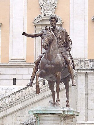 U sredini je, ne prema Michelangelovu ukusu, stajala jedina konjanička bronca koja je preživjela od antike, prikazujući Marka Aurelija, cara filozofa. Michelangelo je osigurao nepretpostavljeni pijedestal za njega. Jedini razlog da je ova skulptura preživjela leži u činjenici da je vlast kršćanske Crkve tijekom srednjeg vijeka mislila da kip prikazuje cara Konstantina, prvog rimskog cara koji je legalizirao kršćanstvo u carstvu, i koji se prekrstio na kršćansku vjeru na samrtničkoj postelji (337.). Današnja bronca postavljena na tom mjestu je moderna kopija, a original se čuva u obližnjem Palazzo dei Conservatori.