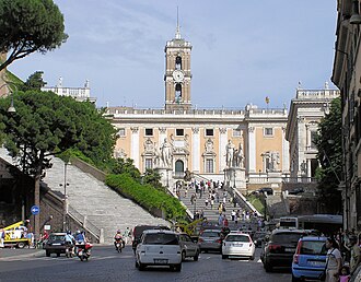 Sagrađen tijekom 13. i 14. stoljeća, Palazzo Senatorio ("Senatorska palača") stoji nad Tabularijem koji je nekoć udomljavao arhive antičkog Rima. Blokovi peprino mramora ugrađeni u Tabularij ponovo su korišteni na lijevoj strani palače i uglu zvonika. Danas se tu nalazi rimska gradska vijećnica. Dvostruke stube dizajnirao je Michelangelo. Fontana ispred stuba sadrži riječne bogove Tibera i Nila kao i Deu Romu (Minervu). Zvonik je dizajnirao Martin Longhi Stariji, a sagrađen je između 1578. i 1582. Trenutnu fasadu dizajnirali su Giacomo della Porta i Girolamo Rainaldi.
