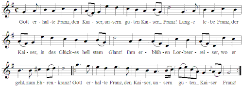 1. Gott erhalte Franz, den Kaiser, Unsern guten Kaiser Franz! Lange lebe Franz, der Kaiser, In des Glückes hellstem Glanz! Ihm erblühen Lorbeerreiser, Wo er geht, zum Ehrenkranz! Gott erhalte Franz, den Kaiser, Unsern guten Kaiser Franz!