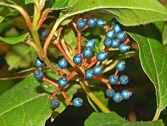 Cvjetovi su mali, bijele ili ružičaste boje; zimi izbijaju iz crvenkasto-ružičastih pupova u gustom cvatu, 5–10 cm širokom. Mirisni cvjetovi su dvospolni i petokraki, a cvatu od listopada do lipnja. Oprašuju ih kukci. Bobice, koje su tamnomodre, metaličaste boje, duge 5-7 mm, u medicini se upotrebljavaju kao purgativ.[1]