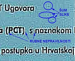 - digitalne fotografije kod velikih povećanja pokazuju rubne nepravilnosti na oštrim granicama i pojavu neželjenih ornamenata na inače mirnim, jednobojnim površinama (tzv. "šum" slike), osobito kod memorijski manje zahtjevnog JPG formata.