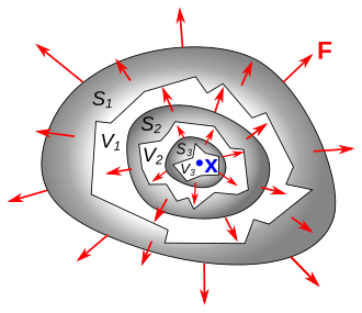 Ovdje je V volumen zahvaćen zatvorenom plohom S(V) koja okružuje točku , a dSinfinitezimalni element plohe sa smjerom normale na plohu.
