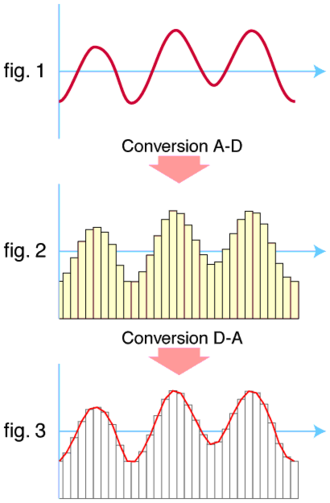 Pod pojmom analognog električnog signala podrazumijevamo, pojednostavljeno rečeno, takav električni signal koji je u svakom trenutku vremena prisutan u sustavu (Slika desno: fig.1). Prilikom konverzije analognog signala u digitalni (fig.2) određenom frekvencijom uzimaju se uzorci analognog električnog signala i izražavaju u digitalnom obliku, gdje na primjer slijed od 10 binarnih znamenki označava 1024 mogućih različitih analognih razina – unoseći prilikom konverzije digitalnog signala u analogni (fig.3) pogrešku manju od 0,1%. Digitalni sustavi su znatno manje ili skoro uopće nisu osjetljivi na neke oblike smetnji te imaju i niz drugih prednosti što je uvjetovalo brz razvoj digitalizacije procesa snimanja i reprodukcije zvuka te sveopću primjenu.