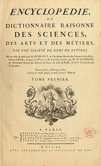 Godinu dana poslije izlaska prvog sveska Enciklopedija je bila privremeno zabranjena, ali već godinu dana poslije 1753., nastavlja izlaziti. U samom početku bio je to prijevod engleske enciklopedije Ephraima Chambersa Cyclopaedia, or Universal Dictionary of Arts and Sciences, koja je objavljena u 1728.u dva sveska, ali vremenom dolazi da značajnog proširenja i politizacije tekstova s velikim brojem liberalnih i progresivnih ideja. Zadnji dio je objavljen 1772. i cijela Enciklopedija se sastojala od 17 tekstovnih i 11 svezaka s ilustracijama.