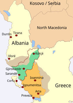 Siva: približna površina Epira u antici; Naračasta: Grčka periferija Epir; Zelena: približna površina najveće koncetracije Grka u sjevernom Epiru, početak 20. stoljeća[1] Crvena isprekidana linija: teritorij Autonomne Republike Sjeverni Epir (1914.). |