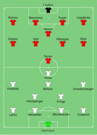 | Njemačka Datoteka:Flag of Germany.svg | 0 : 1 | Datoteka:Flag of Spain.svg Španjolska | Ernst Happel Stadion, Beč Broj gledatelja: 51.428 Sudac: Datoteka:Flag of Italy.svg Roberto Rosetti |