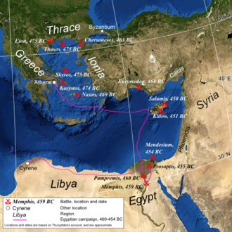 Krajem 460-ih pr. Kr. Atenjani su se odlučili na ambiciozan potez podrške ustanku u perzijskoj satrapiji Egiptu. Iako su grčke snage u početku nizale uspjehe, nisu uspjeli zauzeti perzijski garnizon u Memfisu ni nakon tri godine opsade grada[127]. Perzijanci su tada krenuli u protunapad pa se atenska vojska našla pod opsadom 18 mjeseci, nakon čega je potpuno uništena[128]. Ovaj katastrofalan atenski poraz kao i međugrčki vojni sukobi prisilio je Atenu na odustajanje od ratova protiv Perzijskog Carstva[129]. Godine 451. pr. Kr. u Grčkoj je dogovoreno primirje pa je Kimon nesmetano mogao pokrenuti novu vojnu ekspediciju na Cipru. Ipak, prilikom opsade grada Kitiona Kimon je umro, a atenska mornarica odlučila se povući. Prilikom bijega uspjela je pobijediti perzijsku mornaricu kod ciparske Salamine 450. pr. Kr. koja ih je pokušala spriječiti u povlačenju[130]. Ovaj neuspješni atenski pohod označio je kraj neprijateljstva između Delskog saveza i Perzijskog Carstva, odnosno prestanak vojnih operacija grčko-perzijskih ratova[131].