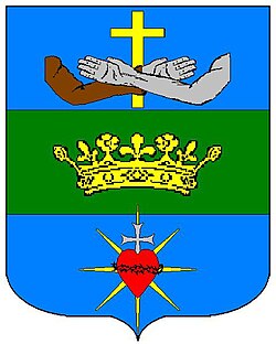 (HR) Vodoravna podjela na trećine. 1 trećina: na plavom polju prekrižene ruke, iza njih zlatni križ, desna srebrena ruka i lijeva srebrena ruka u smeđem rukavu (grb franjevačkog reda), 2 trećina: na zelenom polju zlatna kruna, 3 trećina: na plavom polju crveno srce opasano crnom trnovom krunom, iznad srca izlazi srebreni križ, iz srca i križa izbija 8 zlatnih krakova. [2/78] | |