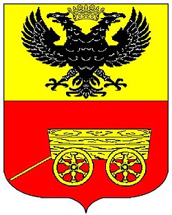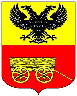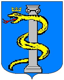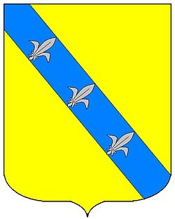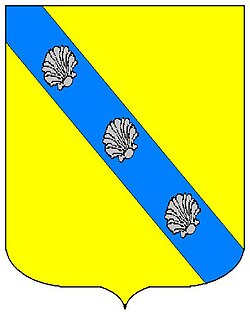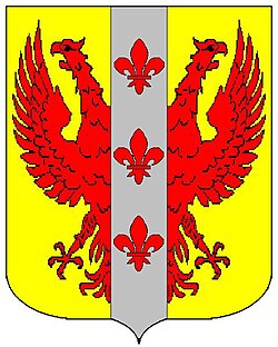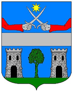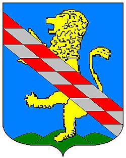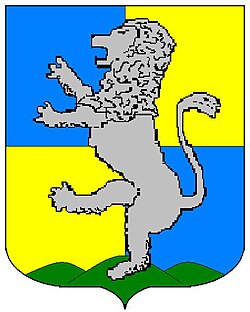 (HR) Na plavom polju zlatni lav koji stoji na zelenom trobrjegu. Preko svega lijevo kosa greda, duž grede dva reda srebreno crvenih paraleograma. [1/24] | |