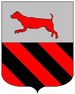(HR) Vodoravna podjela. Gore na srebrenom polju crveni pas u trku, dolje tri para lijevo kosih greda crno srebrene. [1/25, 2/5] | |