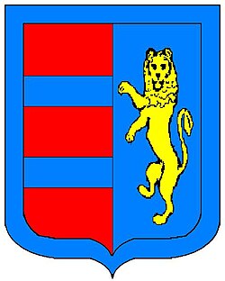 - (HR) Okomita podjela s okvirom plave boje. Lijevo na crvenom polju dvije vodoravne plave grede, desno na plavom polju zlatni lav. [4/15]