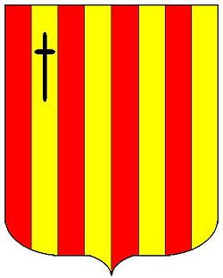 (HR) Četiri para okomitih greda crveno-zlatne, na prvoj zlatnoj gredi crni križ. [1/26]