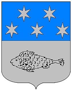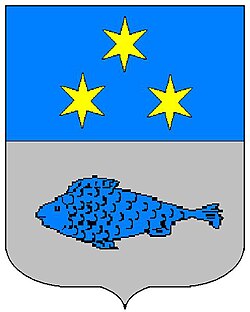 - (HR)Vodoravna podjela. Gore na plavom polju pet šestero krake srebrene zvijezda 2, 3. Dolje na srebrenom polju srebrena riba. [1/5, 2/179]