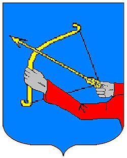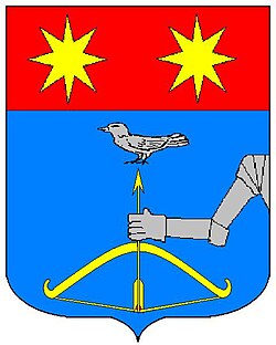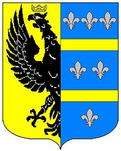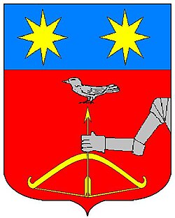 (HR) Na plavom polju lijevo kosa zlatna greda, duž grede tri crvena ljiljana. Iznad i ispod grede po jedna šestero kraka srebrena zvijezda. [1/6, 6/5] | |