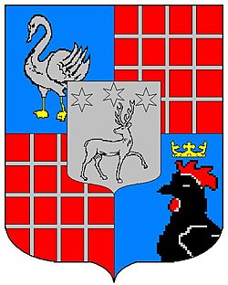 (HR) Podjela na četvrtine sa središnjim grbom: 1 četvrtina: na plavom polju srebreni labud, 2 i 3 četvrtina: na crvenom polju srebrene rešetke (tri okomite i tri vodoravne grede), 4 četvrtina polovina crnog pijetla okrunjenog zlatnom krunom, koji izlazi s desna, središnji grb: na srebrenom polju srebreni jelen u hodu na desno glavom okrenut na lijevi, iznad jelena tri šastokrake srebrene zvijezde. [6/17] | |