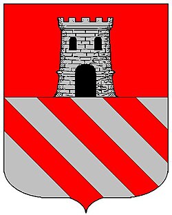 (HR) Vodoravna podjela. Gore na crvenom polju srebrena kula, dolje na srebrenom polju tri lijevo kose srebrene grede. [1/46] | |