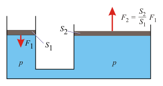 Hidraulični tijesak [2] omogućuje da se primijenjena sila F1 duž nekog puta pretvori u veću silu F2 duž manjeg puta i da se sila poveća onoliko puta koliko je površina gonjenog hidrauličkog cilindra S2 veća od površine pogonskog hidrauličkog cilindra S1: [3]