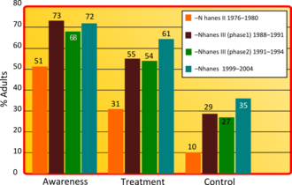 U SAD-u je povišeni krvni tlak najčešći kronični zdravstveni problem koji navodi bolesnike na odlaske liječniku primarne zdravstvene zaštite. American Heart Association je procijenila da su posredni i neposredni troškovi liječnja hipertenzije u 2010. godini iznosili 76.6 milijardi $.[83] U SAD-u je 80% osoba s hipertenzijom svjesno svoje bolesti, a 71% se liječi nekim od antihipertenziva. Međutim, samo 48% bolesnika s hipertenzijom koji su svjesni svoje bolesti, na odgovarajući način kontroliraju bolest.[83] Inadequacies in diagnosis, treatment, or control of high blood pressure can compromise the management of hypertension.[95] Zdravstveni radnici su suočeni s brojnim preprekama pri osiguranju redovite kontrole krvnog tlaka, uključujući i otpor bolesnika prema uzimanju više lijekova odjednom kako bi se postigle ciljne vrijednosti tlaka. Bolesnicima je teško pridržavati se redovitog uzimanja lijekova i promjena u načinu života. Ipak, dostizanje ciljeva je moguće. Snižavanje krvnog tlaka znakovito smanjuje troškove naknadnog liječenja komplikacija.[96][97]