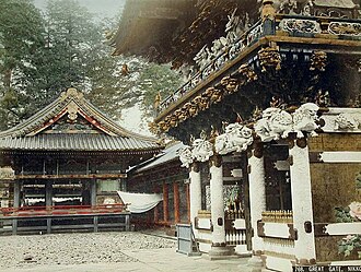 Šintoističko svetište | 1617. | 36°45′30″N 139°35′47″E / 36.75833°N 139.59639°E | Posvećeno šogunu Tokugawi Iejasuu, svetište Tosho-gu obuhvaća velik broj zgrada. Od njih, 42 građevine su zaštićena svjetska baština UNESCO-a, a od njih su 8 japansko nacionalno blago, a ostalih 34 spomenici kulture. Kompleks od tri svete dvorane koje tvore tlocrt slova "H" je savršena ilustracija arhitektonskog stila, kasnije poznatog kao Gongen-zukuri. Shômen Karamon i Haimen Karamon, remek-djela izrade su inspirirana stranim stilom, otuda i zajednički naziv: "kineska vrata". Yômeimon (slika gore desno), podignuta 1636. godine, su vjerojatno najpoznatiji primjer arhitektonskog stila Nikko. On je pokriven bogatstvom i beskonačnom raznolikošću ukrasa. Tôzai Sukibe, također iz 1636., je 160 m dug zid oko skupine dvorana Honden, Ishinoma i Haiden. Tôzai Kairo, natkriveni prolaz dug 220 m, na južnom dijelu ima 25 reljefnih ploča, koje s tri strane okružuju isku skupinu dvorana (Honden, Ishinoma i Haiden). |