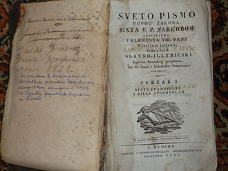 U doba reformacije nastojalo se i na hrvatski prevesti cijelu Bibliju. Stjepan Konzul Istranin i Anton Dalmatin preveli su i objavili Prvi del Novog Testamenta i Drugi drugi del Novog Testamenta (glagoljicom po 1000 primjeraka, Tübingen, 1562. i 1563.; ćirilicom po 1000 primjeraka "za istočne zemlje", Tübingen, 1563.). Mihajlo Bučić međimurski kalvinski pastor je preveo Novi zakon (1573.). Stari zavjet u cjelini preveli su Juraj Juričić i Juraj Cvečić, ali su tiskani su samo Proroci latinicom (1564. u 50 primjeraka, pokusno) i Proroci glagoljicom (1564. u 50 primjeraka, pokusno).[2]