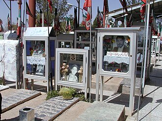 | Pogreška pri izradbi sličice: Od gore, u smjeru kazaljke na satu: iranski vojnik s plinskom maskom, iranski vojnici nakon oslobođenja Horamšahera, Donald Rumsfeld i Saddam Hussein se sastaju u Bagdadu kako bi raspravljali o američkoj vojnoj pomoći, iranska nafta platforma nakon napada američke mornarice. | |||||||||