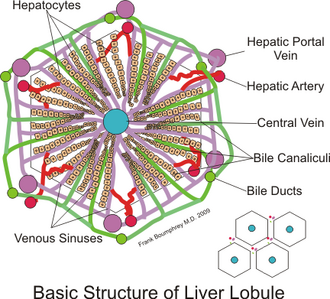 Jetra je sastavljena od velikog broja temeljnih funkcionalnih jedinica koje se nazivaju jetreni režnjići (lobul). Jetreni režnjić je heksaedričnog oblika. U središtu lobula nalazi se centralna vena, oko koje se zrakasto šire gredice jetrenih stanica hepatocit. Gredica se sastoji od dva niza heptocita između kojih se nalazi žučni kanalić. Jetreni režnjići su međusobno razdvojeni vezivnom pregradom koja sadrži venule nastale grananjem portalne vene i jetrene arteriole nastale grananjem jetrenih arterija, te žučne kanale i limfne žile. Venska krv iz portalnih venula u vezivnim pregradama teče jetrenim sinusoidama prema središtu jetrenog režnjića u centralnu venu. Jetrene sinusoide se sadrže brojne otvore te tvari iz venska krv lako odlaze u prostor između stanica stijenke sinusoida i jetrenih stanica. Taj prostor se naziva Disseov prostor, iz kojega tekućina odlazi u limfne žile.