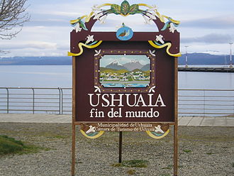 Plakat s legendom "Ushuaia, kraj svijeta". Ushuaia u Argentini je najjužniji grad na svijetu