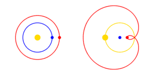 Kretanje Sunca (žuto), Zemlje (plavo) i Marsa (crveno) prema heliocentričnom sustavu (lijevo) i geocentričnom sustavu (desno).