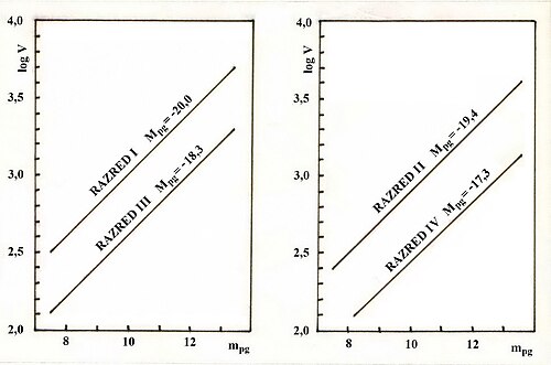 Na slici 13. prikazani su položaji pojedinih razreda sjaja u dijagramu prividna veličina / radijalna brzina. Ovisnost logaritma udaljenosti i prividne veličine je linearna: