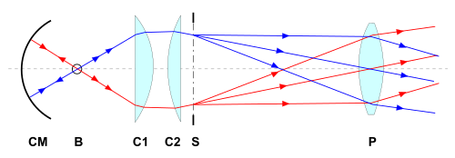 C1, C2 = optičke leće kondenzora, S = klizač (membrana), P = projekcijska leća.