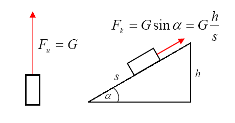 Na gornjoj skici nisu prikazane sve sile koje djeluju na tijelo, nego samo sila koja jednoliko podiže tijelo, ravno uvis ili po kosini. U oba slučaja sila će izvršiti jednak rad (kad nema trenja) jer tijelu mijenja samo potencijalnu energiju, a ta promjena ovisi samo o visinskoj razlici, što je u ovome primjeru visina kosine. U ovako jednostavnom slučaju rad se računa kao sila puta put, pa je Obrada nije uspjela. (Conversion error. Server ("https://wikimedia.org/api/rest_") reported: "Cannot get mml. Server problem."): {\displaystyle \scriptstyle F_{u}h=F_{k}s} . Treba samo uvrstiti umjesto Obrada nije uspjela. (Conversion error. Server ("https://wikimedia.org/api/rest_") reported: "Cannot get mml. Server problem."): {\displaystyle \scriptstyle F_{u}} , pa se dobije gornja formula.