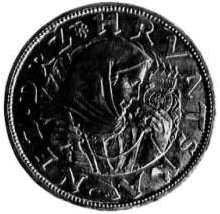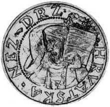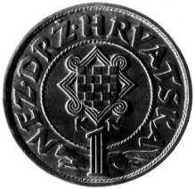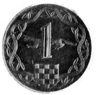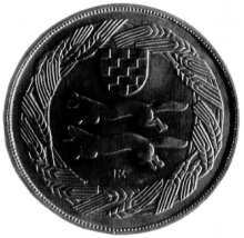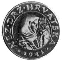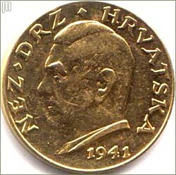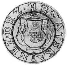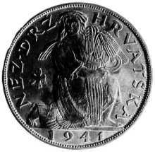 | Pogreška pri izradbi sličice: | 5 kuna | 1934. | Hrvatska revolucionarna organizacija "Ustaša" je izdala ovaj novac povodom 5. godišnjice osnutka ustaškog pokreta, 7 godina prije uspostave NDH. Time su hrvatski rodoljubi u izgonstvu i egzilu pred velikosrpskom politikom Kraljevine Jugoslavije svoju političku borbu nastavili između ostaloga i izradom prvog, jubilarnog novca. Na reversu (zadnja strana) kovanice se nalazio hrvatski grb (u vidu šahovnice s prvim neišaranim, dakle praznim poljem u lijevom gornjem uglu) u okviru od klasja žita s tekstom “ZA NEZAVISNU DRŽAVU HRVATSKU”. Kovanice su bile iskovane najvjerojatnije u Berlinu (Njemačka) iz srebra čistoće Ag 900/1000, zupčastog ruba, promjera 23 mm, te težine 4,34 grama.[4] Postoje i probni otkovi u bronci i leguri bakra i nikla.[5] | ||