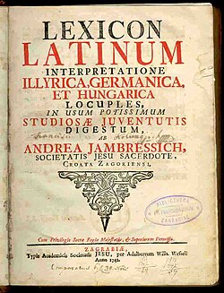 U naslovu zapisano je digestum, ab Andrea Jambressich. Riječ digestum znači priređen, ili sređen, no u skromnom načinu redovničkog izražavanja, svoje značenje može označavati i autorstvo (priređen, od Andrije Jambrešića.). Po tome podatku se ovaj rječnik nazivao Jambrešićevim rječnikom. Pripisuje se rječnik Jambrešiću i Baltazaru Krčeliću, Adamu Baričeviću, Tomašu Mikloušiću, Ivanu Kukuljeviću i Ivanu Milčetiću. Nasuprot Pavel J. Šafárik i Vatroslav Jagić glavnim autorom smatraju Franja Sušnika, dok Jambrešića samo pomagačem.