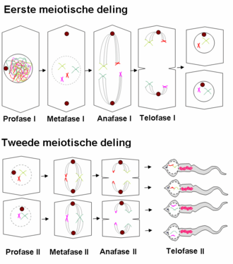 Mejoza se odvija u dvije faze, u mejozi I i mejozi II. Mejoza I dijeli se na podfaze profazu I, metafazu I, anafazu I, telofazu I i citokinezu.[4] Mejoza II dijeli se na podfaze profazu II, metafazu II, anafazu II, telofazu II i citokinezu.[4]