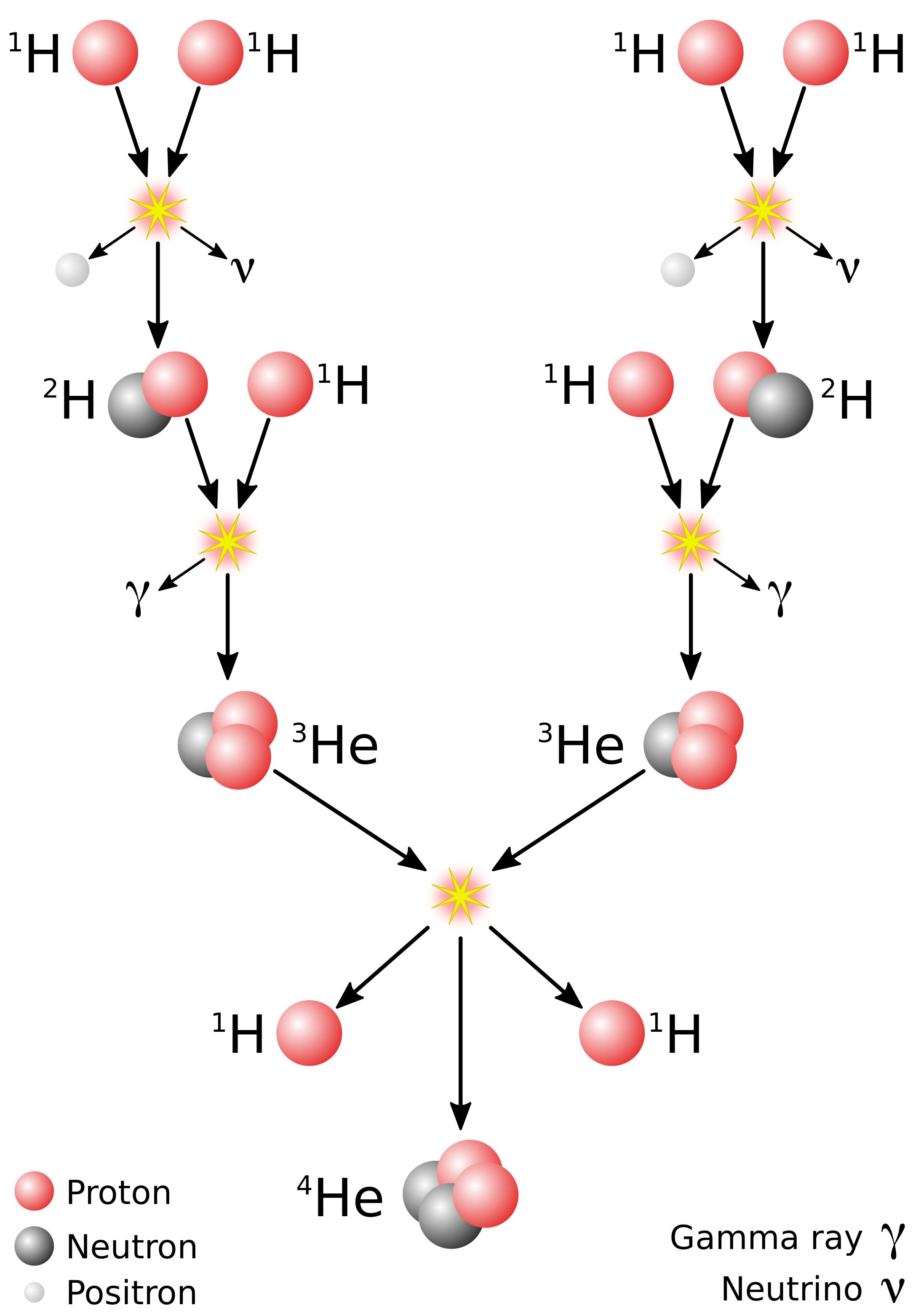 gdje je: c - brzina svjetlosti. Svake sekunde Sunce kroz taj složeni proces fuzije "izgori" u sekundi gotovo 600 milijuna tona vodika u teže atomske jezgre. Pri tome nastaje Sunčevo svjetlo (fotoni) i Sunčevi neutrini. Neutrino neposredno napusti gusti centar Sunca, dok foton treba 100 tisuća godina dok dođe na površinu koju mi opažamo.