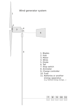 - uređaji za zatvaranje i / ili lažno opterećenje za upotrebu po jakom vjetru kada generirana energija premašuje trenutne potrebe i kapacitet sustava za pohranu.