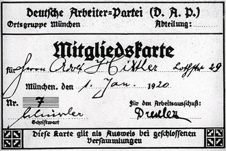 Hitler je bio 55. član stranke i primio broj "555", jer je DAP nadodavao +500 da bi pretjerivali o broju članova stranke. Hitler je kasnije tvrdio kako je on 7. član stranke (ustvari je bio 7. član stranačkog predsjedništva, a kasnije će dobiti i Zlatni stranački znak s brojem "1"). U nekoliko narednih mjeseci, DAP je nastavio dobivati nove članove, no i dalje je ostao previše malen da bi imao utjecaja na njemačku politiku. 24. veljače 1920., stranka je nadodala naziv "nacionalsocijalistička" u službeno ime, te se od tada naziva Nacionalsocijalistička njemačka radnička stranka, ili skraćeno NSDAP, iako je Hitler ranije dao prijedlog da se stranka nazove "Socijalna revolucionarna stranka"; Rudolf Jung je taj koji je odvratio Hitlera od tog naziva.[1]