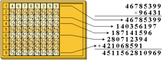 Ako na primjer želimo pomnožiti broj 46785399 sa brojem 7 onda na ploču stavimo štapiće kojima su u prvim kvadratima redom brojevi 4, 6, 7, 8, 5, 3, 9, 9 i pročitamo brojeve u redu u kojem se na lijevom rubu ploče nalazi broj 7. Rezultat se dobiva tako da se zapišu brojevi koje čitamo s desna na lijevo zbrajajući one brojeve koji se nalaze između dvije dijagonalne crte, a onaj zbroj koji je veći od 9 se zapisuje tako da se broj jedinica zapisuje a broj desetica prenosi.