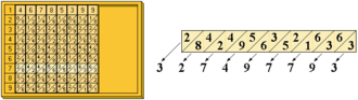 Želimo podijeliti broj 46785399 s brojem 96431. Složimo štapiće na ploču tako da u prvom redu daju broj djelitelja. Zapišemo umnoške tog broja sa svim jednoznamenkastim brojevima kao što je prikazano na slici. Budući da djeljenik ima osam brojeva a svi umnošci djelitelja s jednoznamenkastim brojevima najviše šest, zadnja dva broja djeljenika privremeno zanemarimo, tako da dijeljenik prvo gledamo u skraćenom obliku (bez zadnja dva broja).