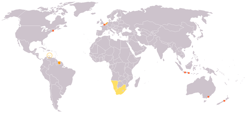 Nizozemska, Belgija (Flandrija), Surinam, Nizozemski Antili, Aruba, Francuska (Nord-Pas-de-Calais), Indonezija |