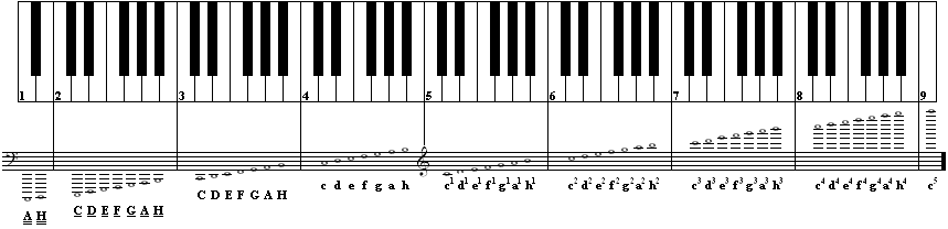 Da bismo razlikovali oktave po visini, svaka ima svoje ime. Na klavijaturi su to note od c do sedam tonova višeg h. Najdublja oktava je subkontra (praduboka), slijede kontra (duboka), velika, mala, prva, druga, treća, četvrta i peta oktava. Klavirska klavijatura obuhvaća skoro sve tonove ovih oktava.