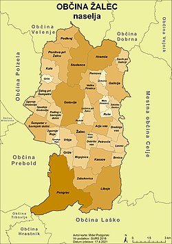 Arja vas, Brnica, Dobriša vas, Drešinja vas, Galicija, Gotovlje, Griže, Hramše, Kale, Kasaze, Levec, Liboje, Ložnica pri Žalcu, Mala Pirešica, Migojnice, Novo Celje, Pernovo, Petrovče, Podkraj, Podlog v Savinjski Dolini, Podvin, Pongrac, Ponikva pri Žalcu, Ruše, Spodnje Grušovlje, Spodnje Roje, Studence, Šempeter v Savinjski dolini, Velika Pirešica, Vrbje, Zabukovica, Zalog pri Šempetru, Zaloška Gorica, Zavrh pri Galiciji, Zgornje Grušovlje, Zgornje Roje, Žalec, Železno
