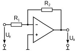 Operacijsko pojačalo u invertirajućem spoju (slika lijevo) zakreće fazu ulaznog signala (Ue) te se on na izlazu operacionog pojačala pojavljuje pojačan (Ua) i fazno zakrenut za 180°.